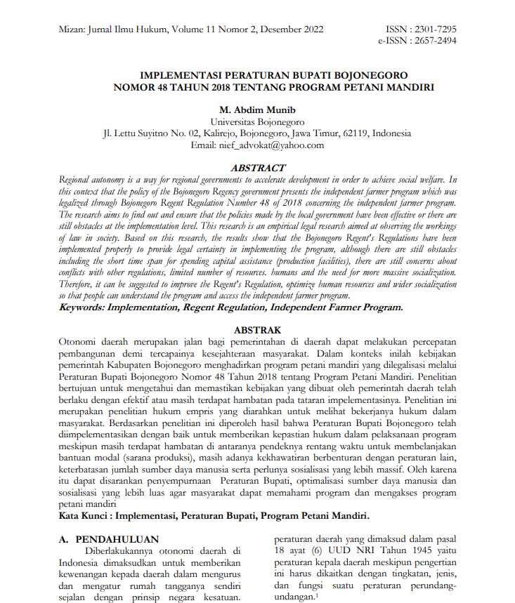 IMPLEMENTASI PERATURAN BUPATI BOJONEGORO NOMOR 48 TAHUN 2018 TENTANG PROGRAM PETANI MANDIRI