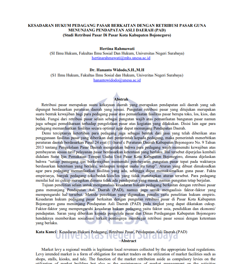 KESADARAN HUKUM PEDAGANG PASAR BERKAITAN DENGAN RETRIBUSI PASAR GUNA MENUNJANG PENDAPATAN ASLI DAERAH (PAD)