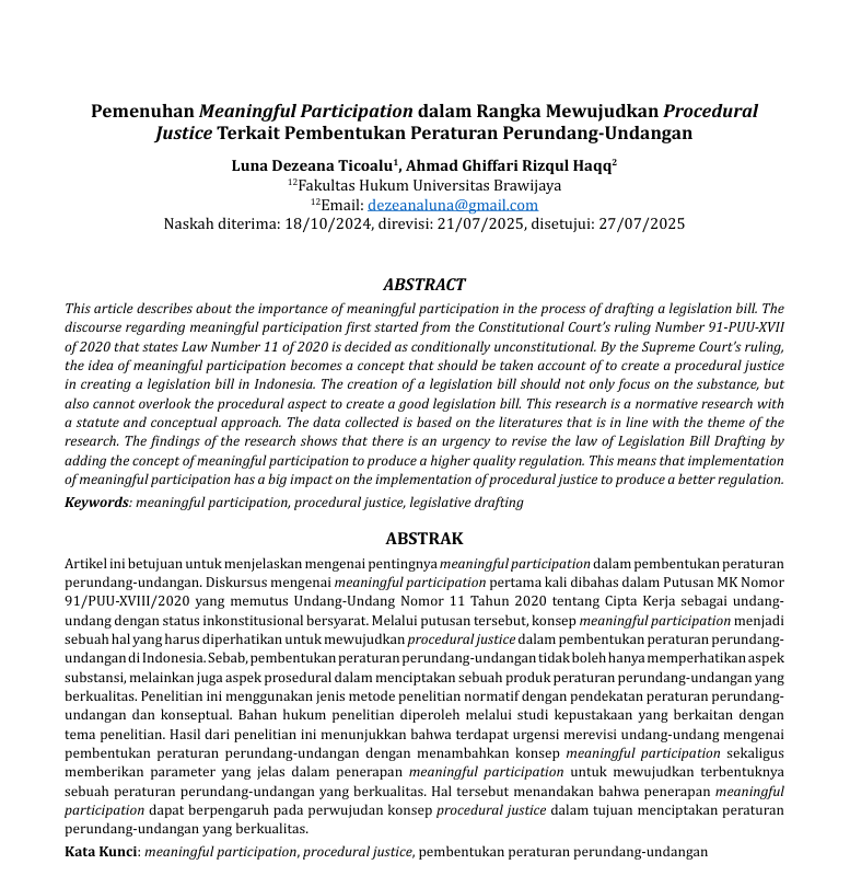 Pemenuhan Meaningful Participation dalam Rangka Mewujudkan Procedural Justice Terkait Pembentukan Peraturan Perundang-Undangan