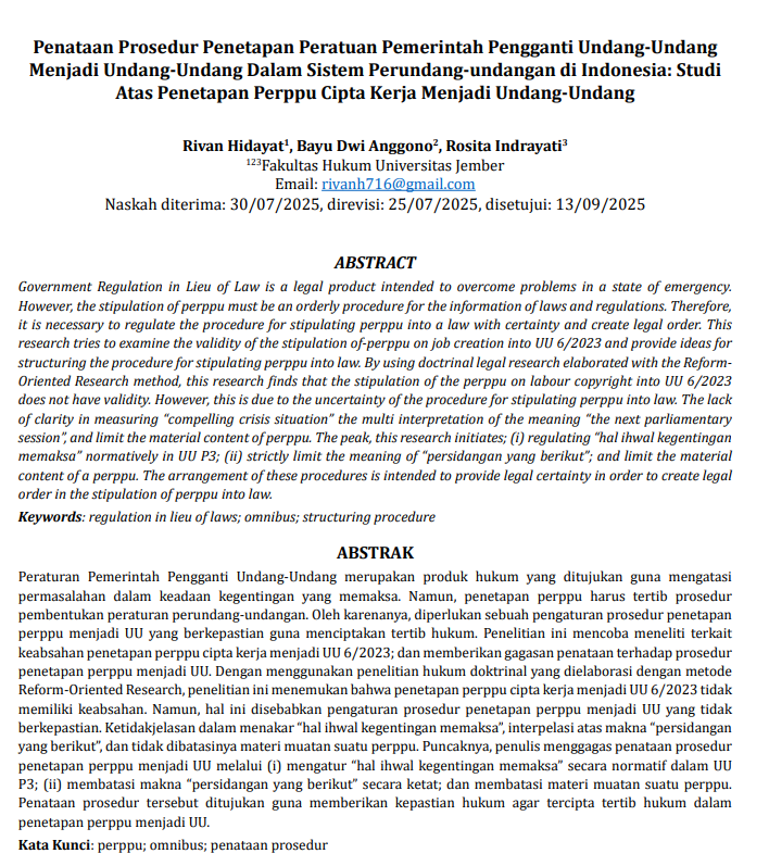 Judul:Penataan Prosedur Penetapan Peratuan Pemerintah Pengganti Undang-Undang Menjadi Undang-Undang Dalam Sistem Perundang-undangan di Indonesia: Studi Atas Penetapan Perppu Cipta Kerja Menjadi Undang-Undang