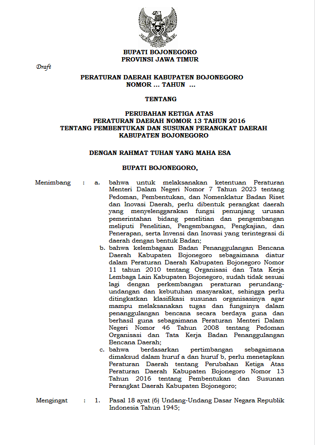 PERUBAHAN KETIGA ATAS PERATURAN DAERAH NOMOR 13 TAHUN 2016 TENTANG PEMBENTUKAN DAN SUSUNAN PERANGKAT DAERAH KABUPATEN BOJONEGORO